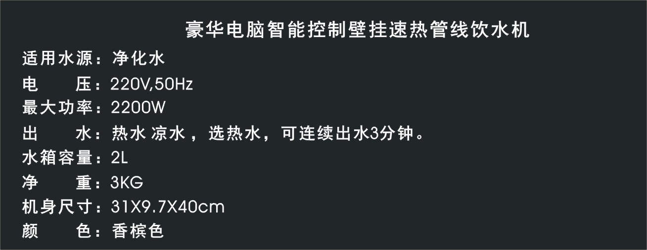 產(chǎn)品名稱:豪華壁掛式速熱管線飲機(jī)產(chǎn)品型號:PJ-27 黑色外形尺寸:31X9.7X40cm